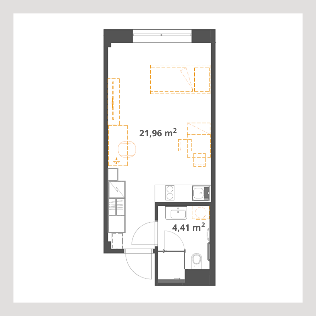 Měsíční ubytování včetně lednice s mrazákem, kuchyňské linky s indukční deskou a vestavné nábytkové stěny včetně šatní skříně, pravidelný úklid 1x ročně, veškerá média (elektřina, voda a teplo), internet, společné prostory, odpady, recepce, společná televizní anténa. Mimo koncesionářské poplatky.